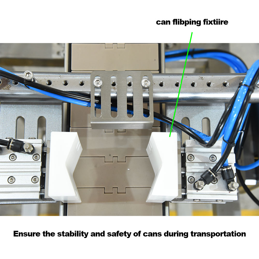 The machine is made of a filp shaft, a drive motor and symmetrical clamping components. Here's how they work efficiently: the drive motor let the turning shafr to rotate, a set of clamping components also rotate simultaneously. These components clamp the middle of the bottle or jar and flip them 180 degrees.
